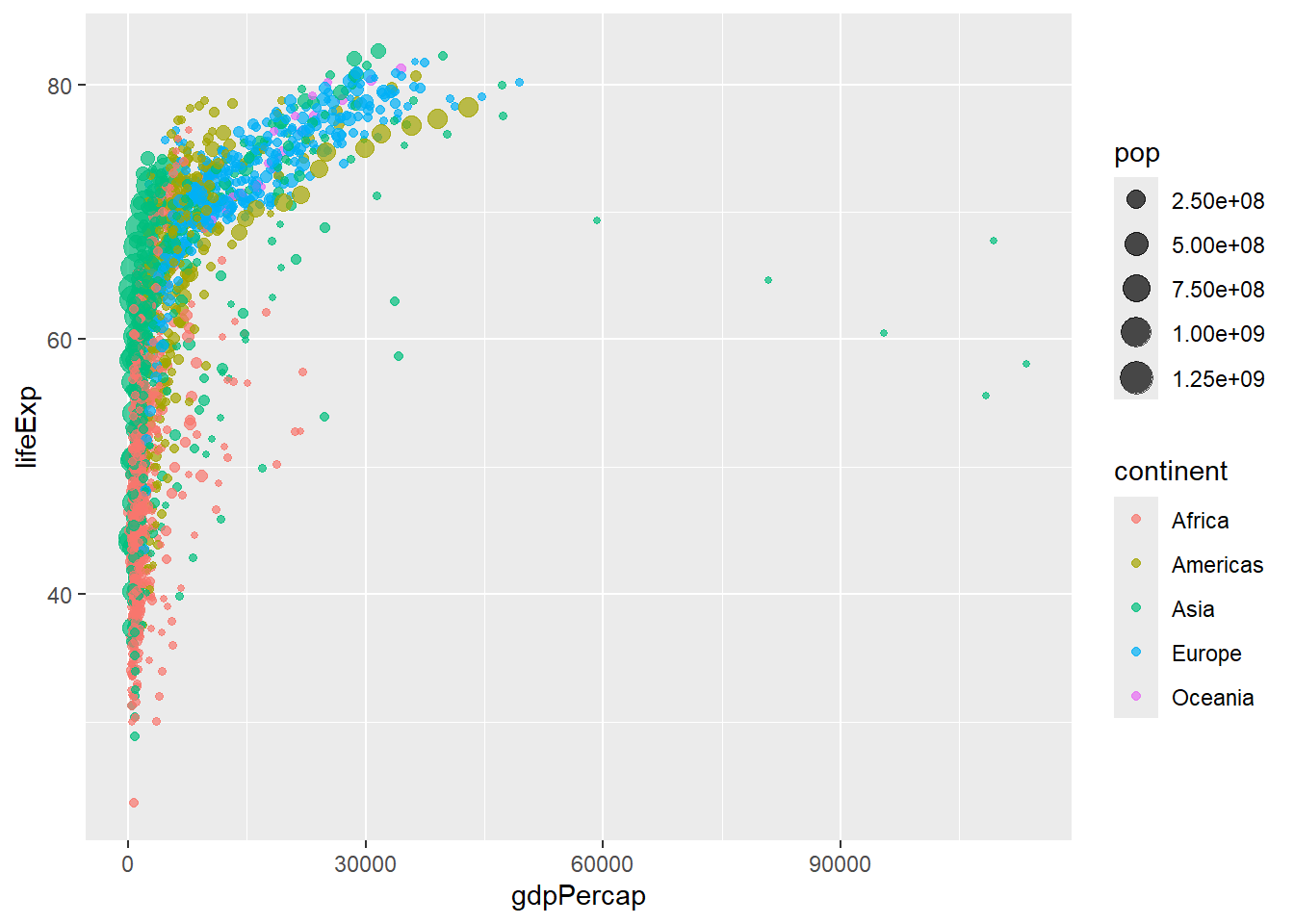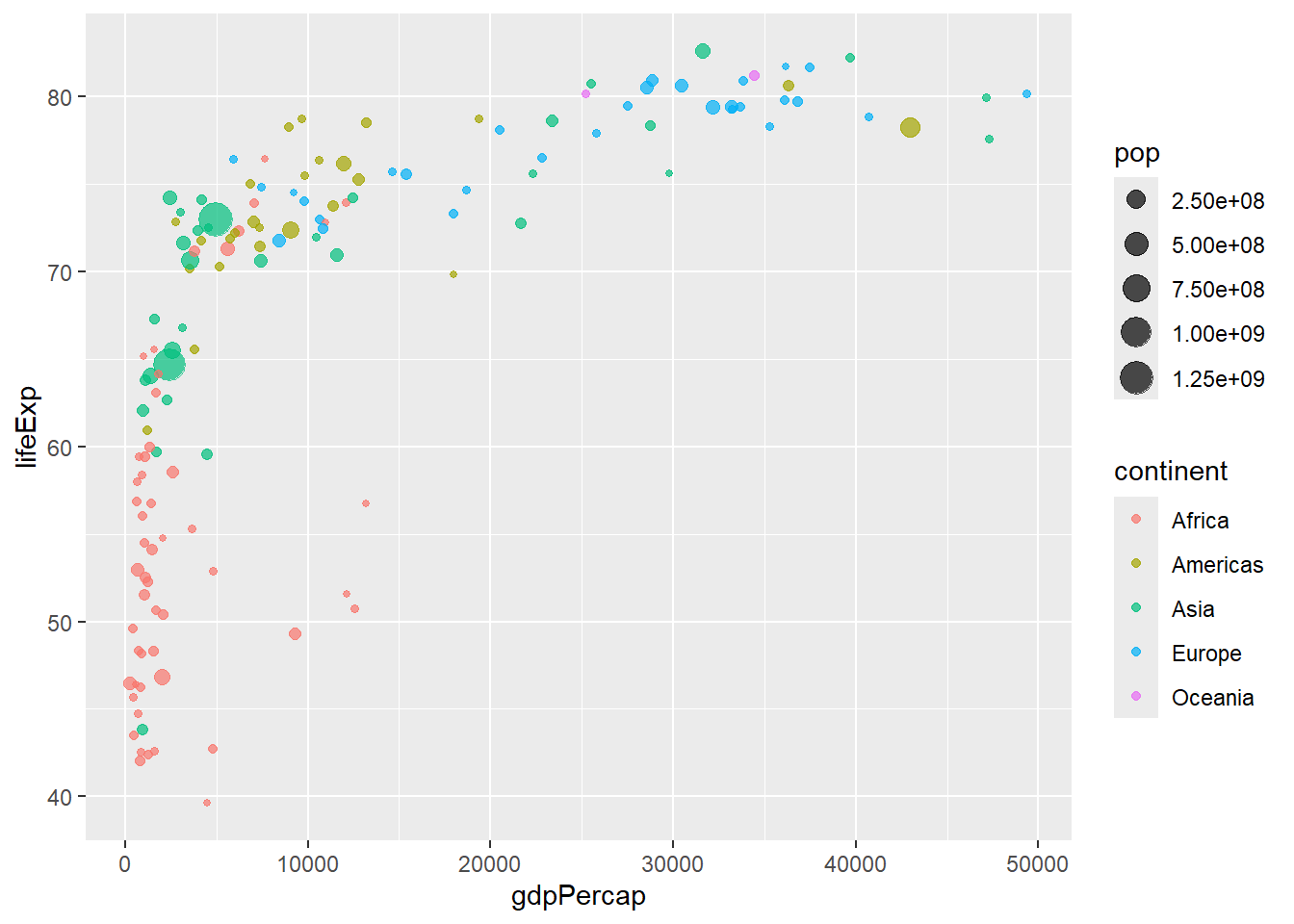 ggplot(aes(x = gdpPercap, y = lifeExp, color = continent, size = pop)) +