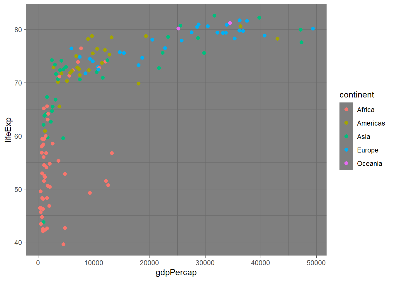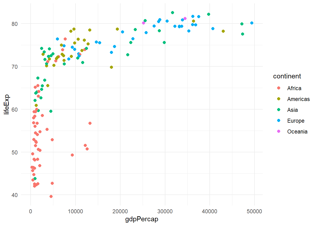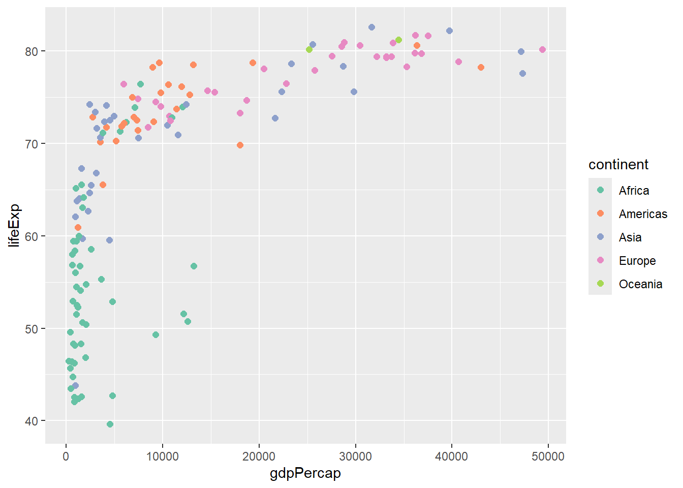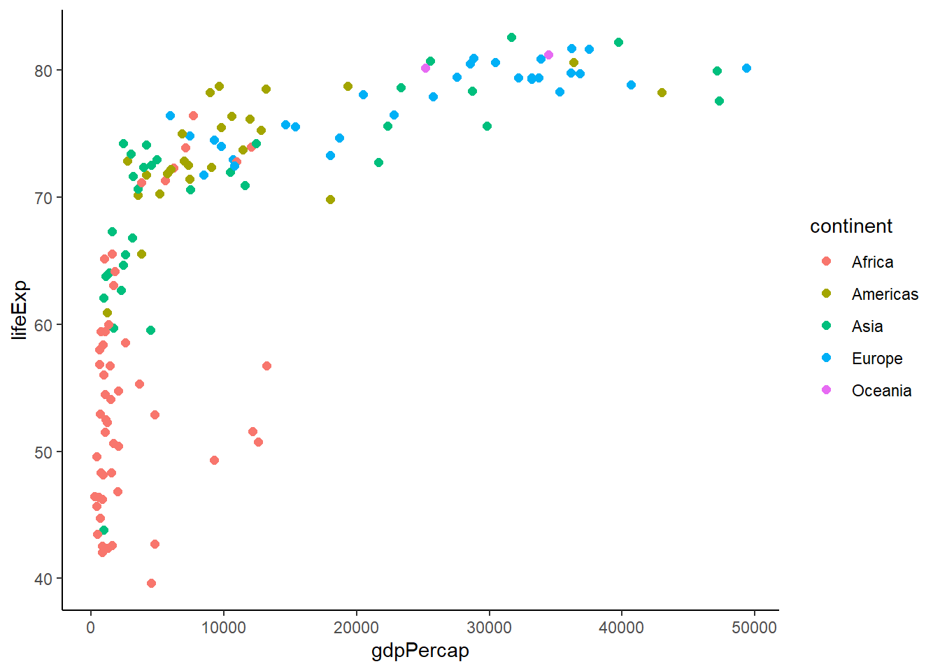 ggplot(data = gapminder, aes(x = gdpPercap, y = lifeExp, color = continent)) +