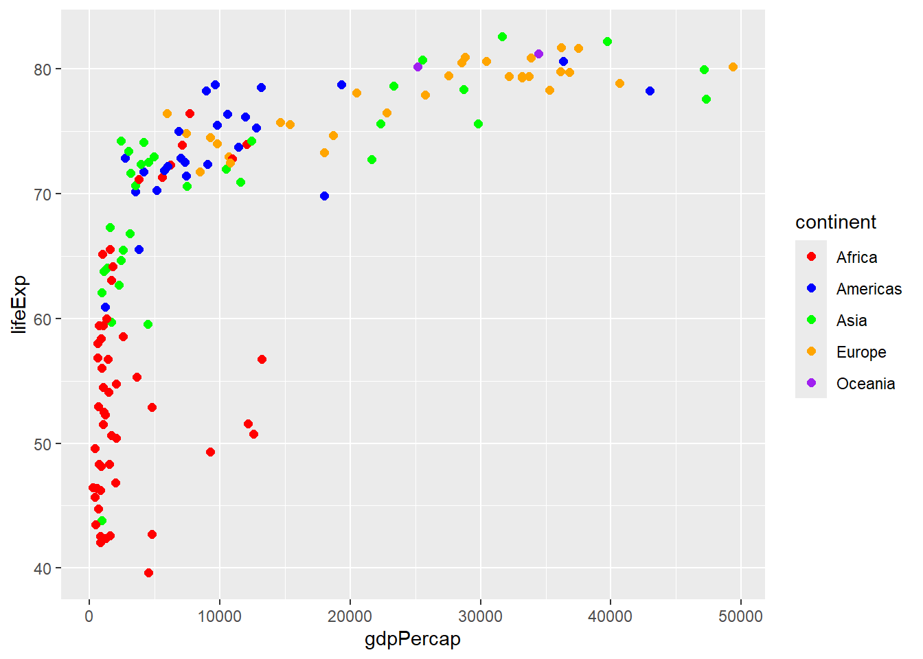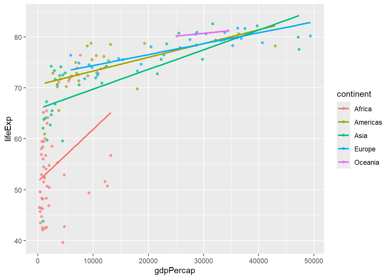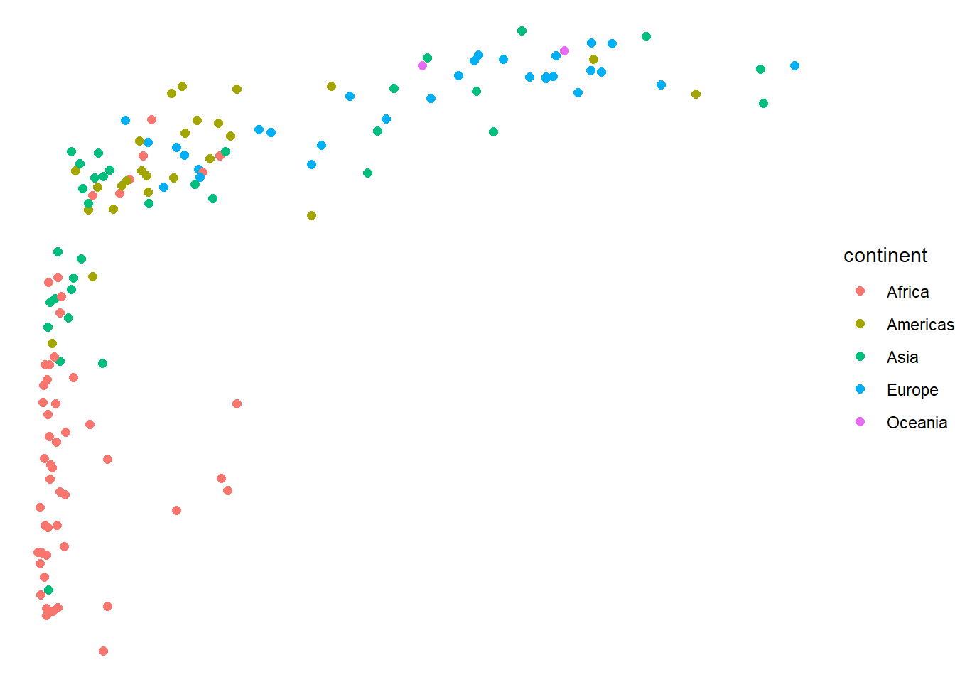 ggplot(data = gapminder, aes(x = gdpPercap, y = lifeExp, color = continent)) +