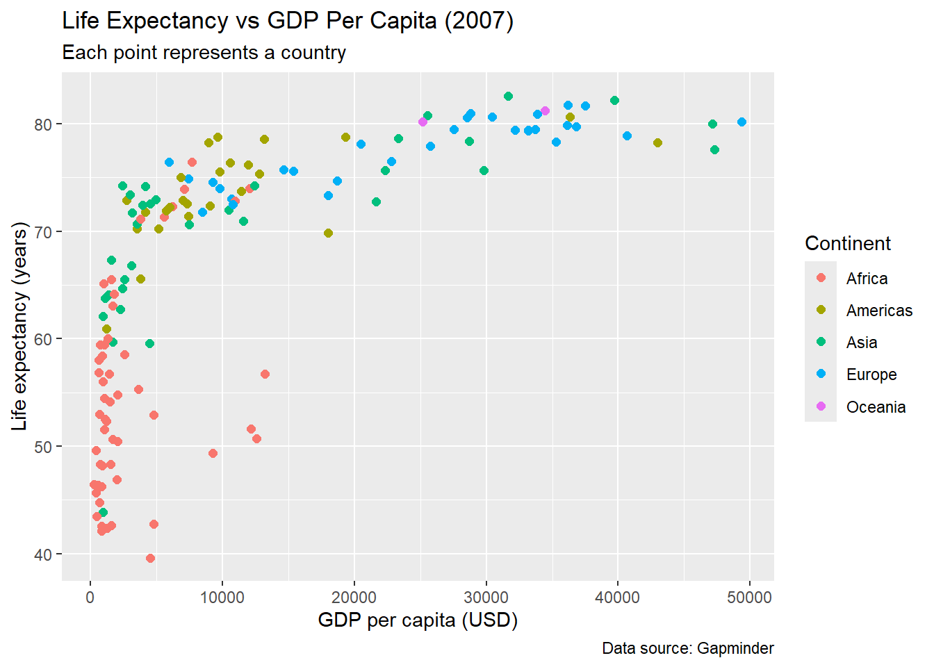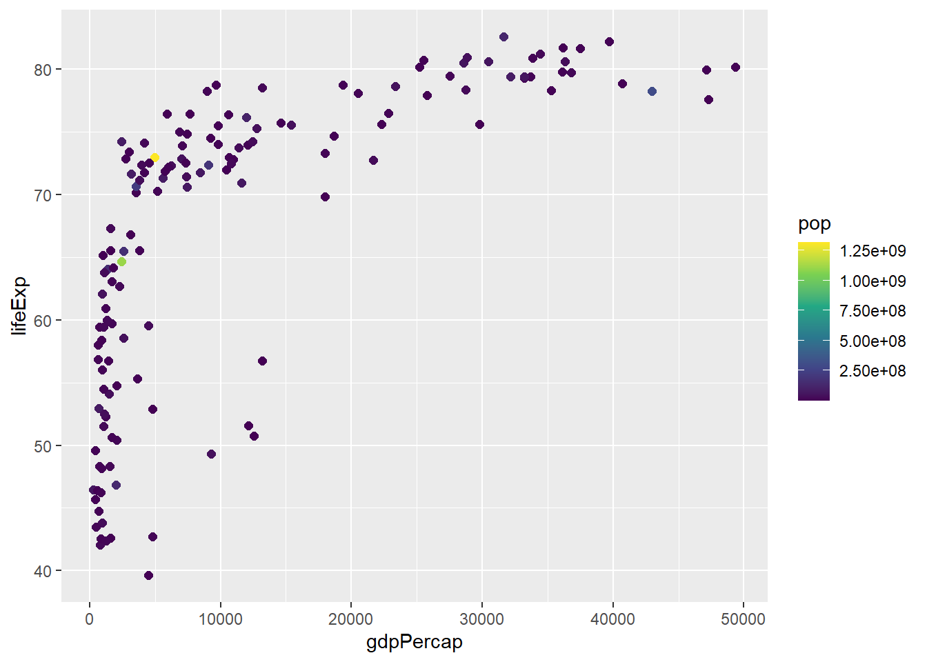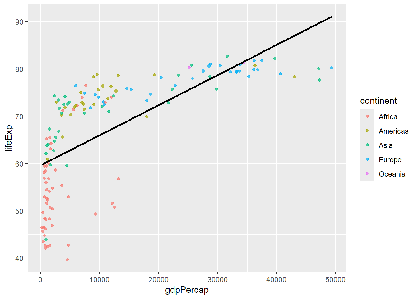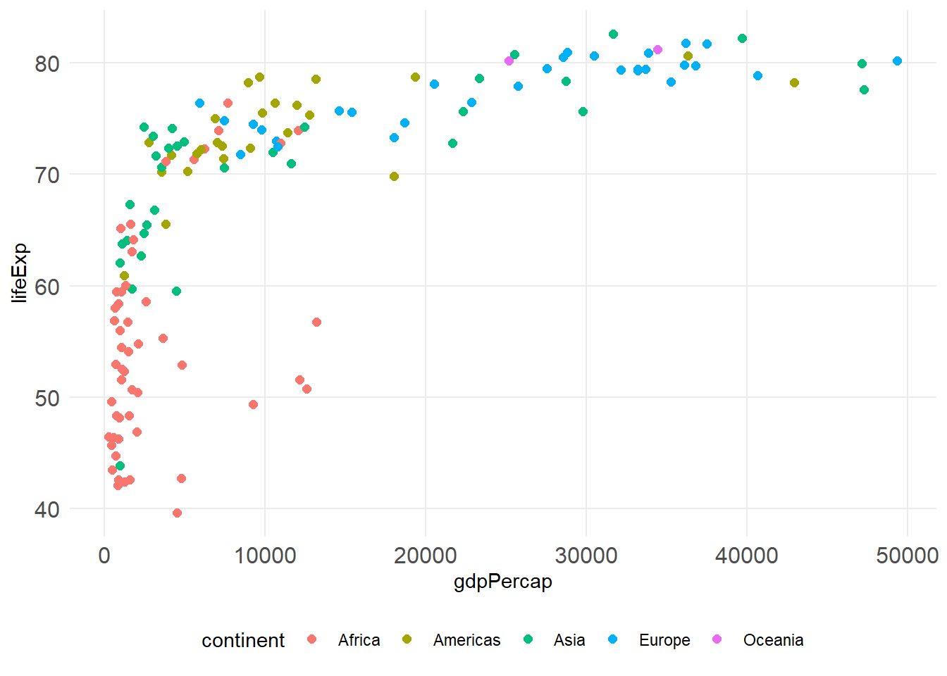 ggplot(data = gapminder, aes(x = gdpPercap, y = lifeExp, color = continent)) +