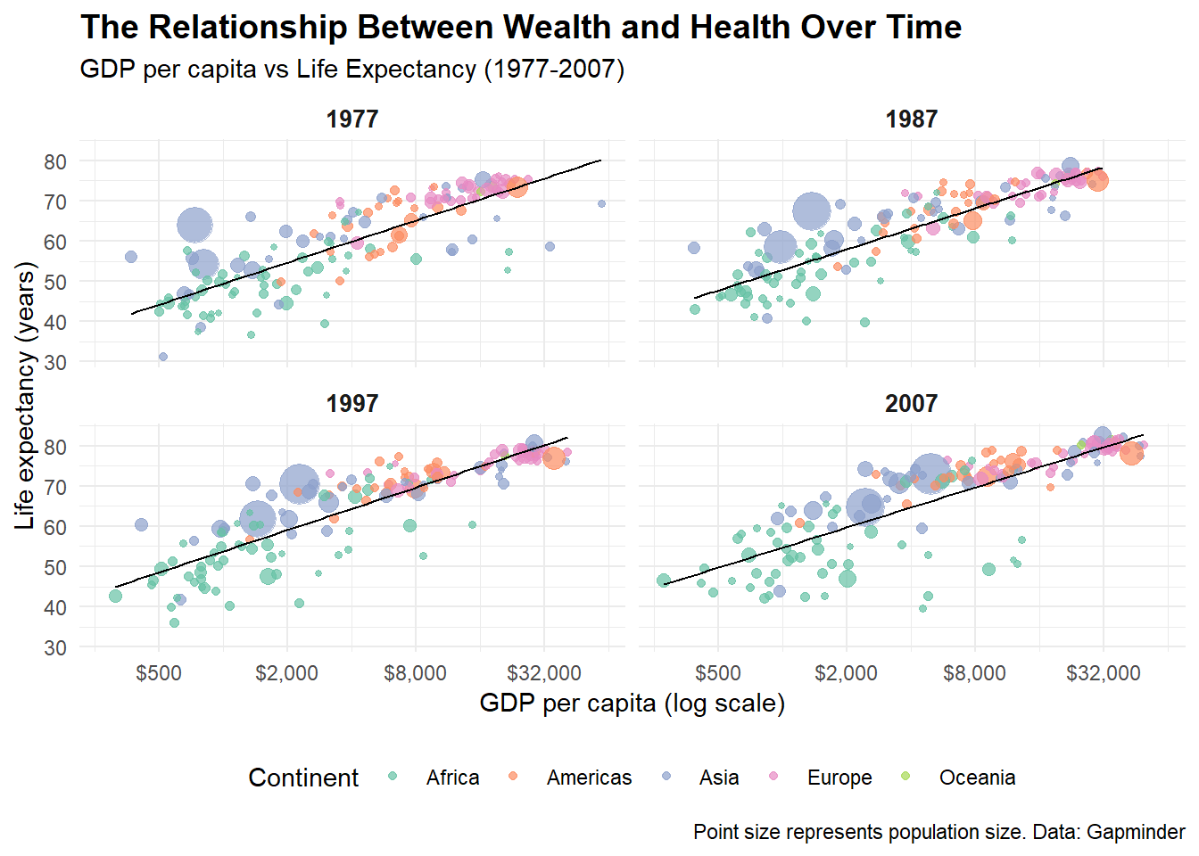 subtitle = "GDP per capita vs Life Expectancy (1977-2007)",