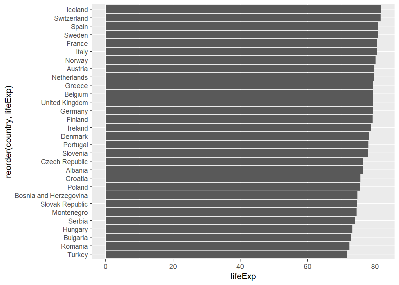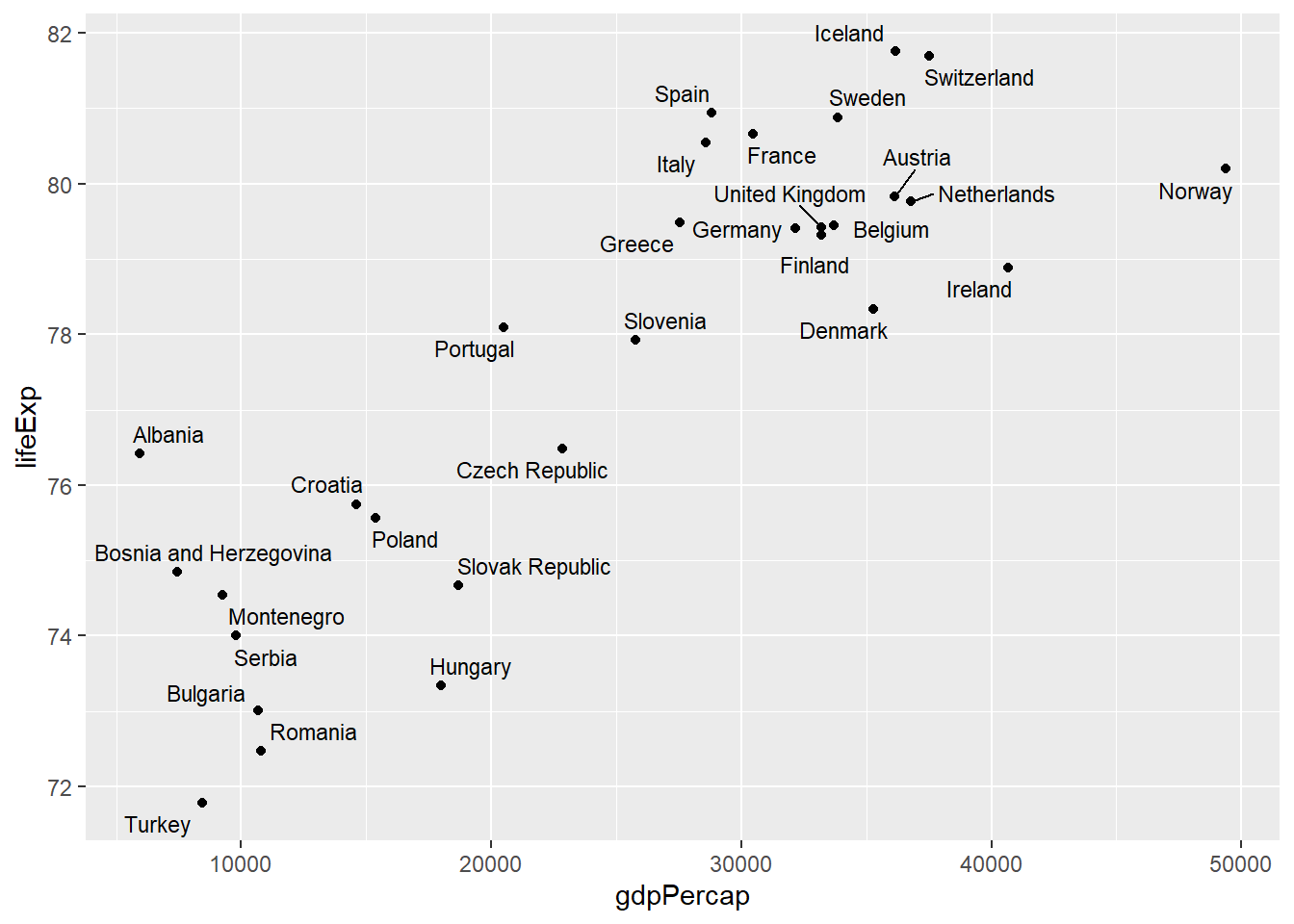 Geoms | Add text labels | geom_text(aes(label = country)) |