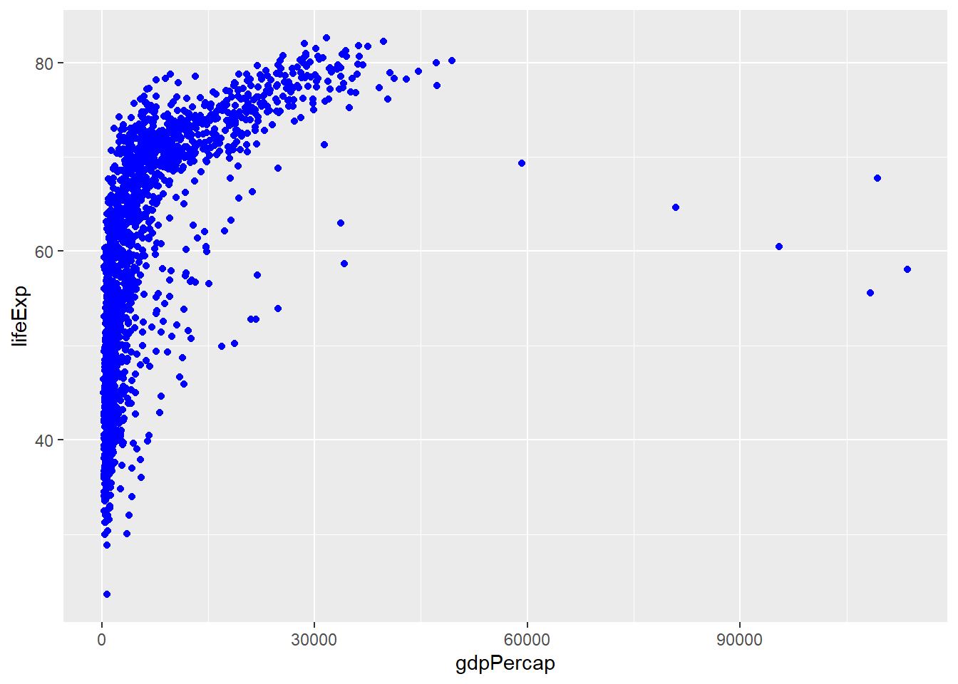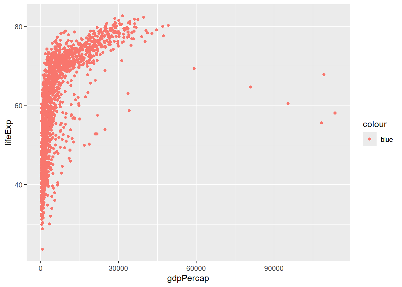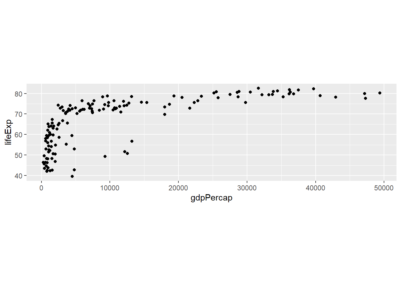 ggplot(data = gapminder, mapping = aes(x = gdpPercap, y = lifeExp)) +