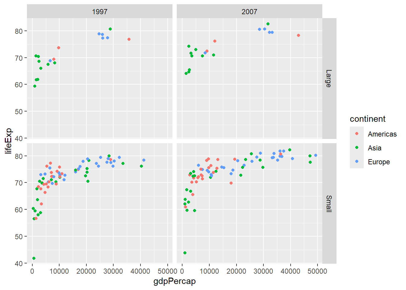 Faceting When comparing groups or categories, faceting (facet_wrap or facet_grid) is often clearer than putting everything into one crowded plot. It makes patterns easier to see across groups.