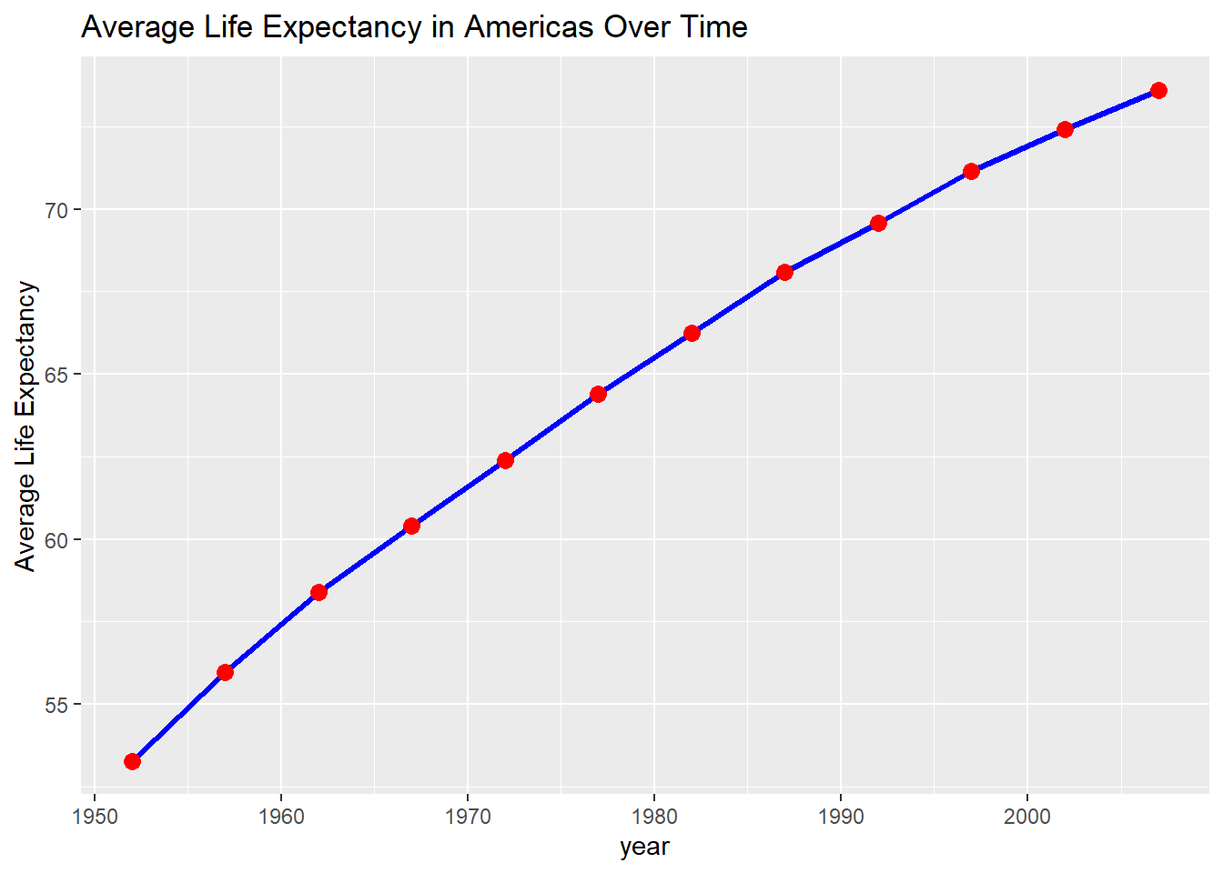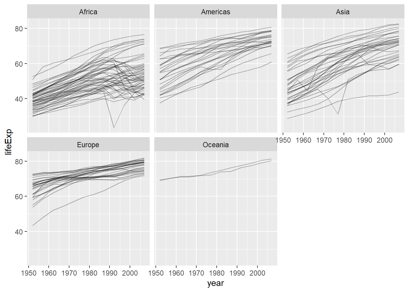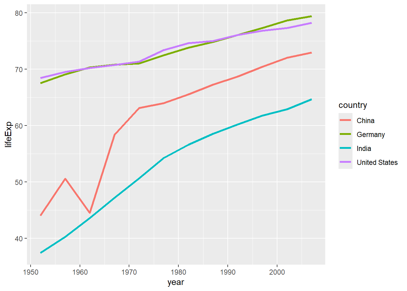 ggplot(aes(x = year, y = lifeExp, color = country)) +