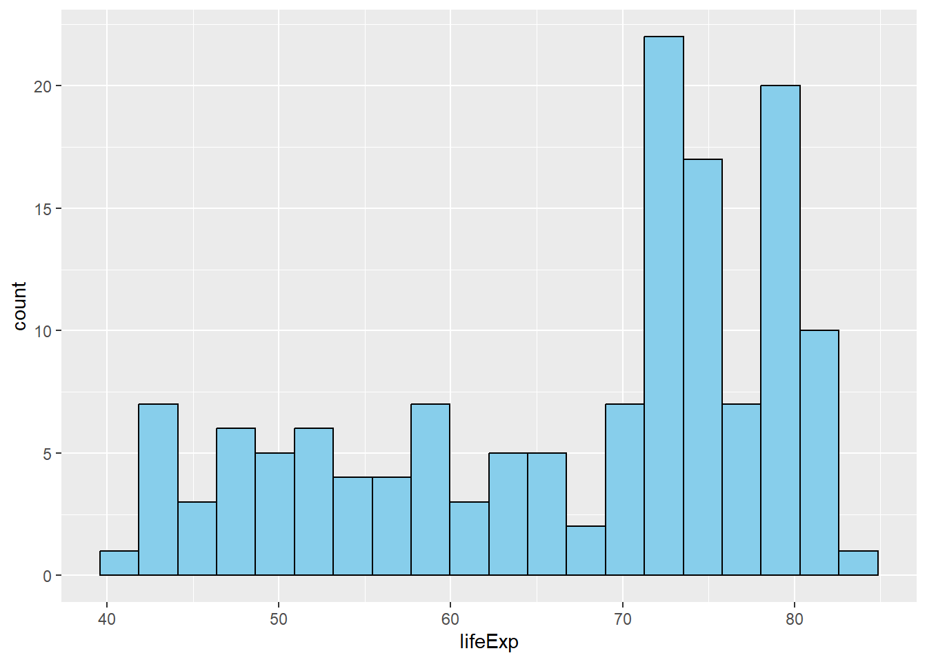 geom_histogram(bins = 20, fill = "skyblue", color = "black")