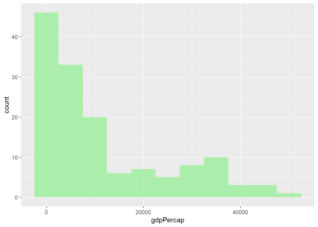 geom_histogram(binwidth = 5000, fill = "lightgreen", alpha = 0.7)