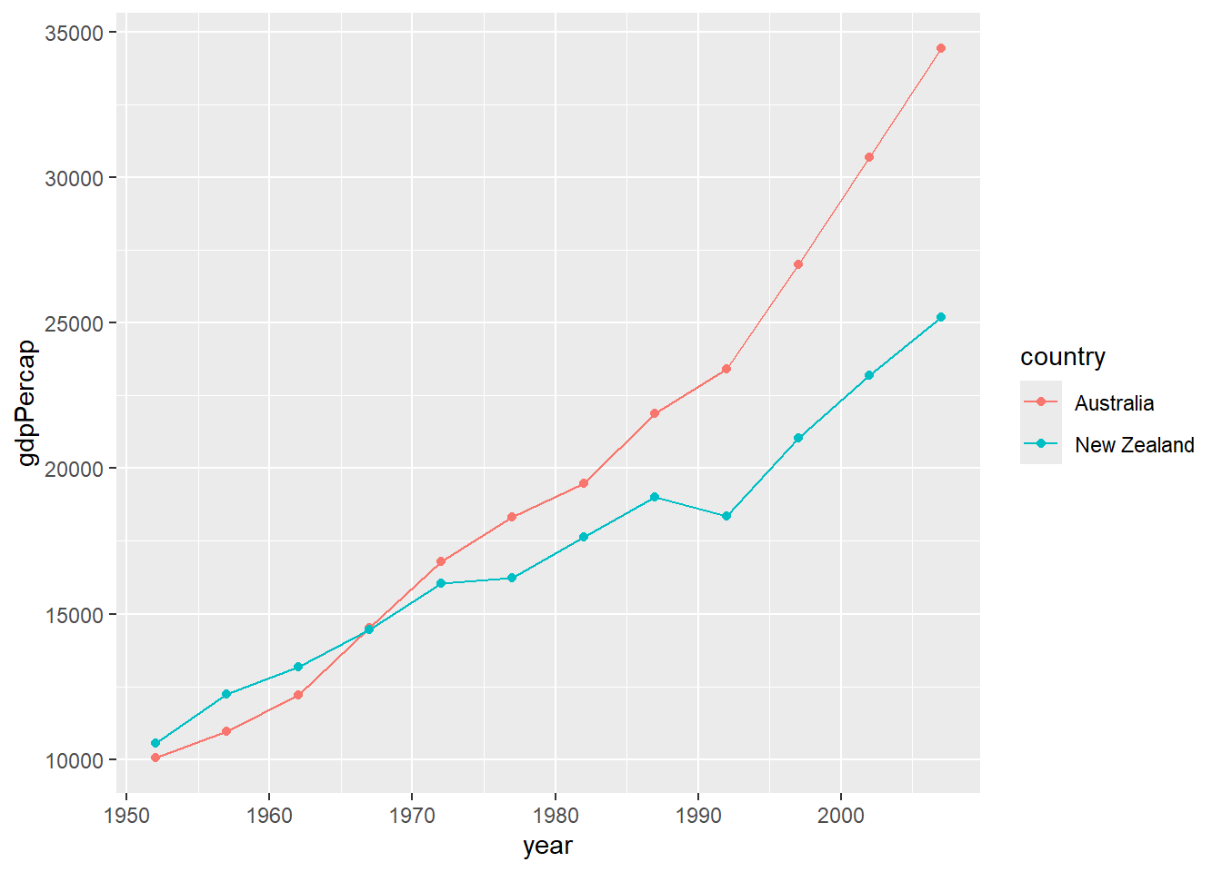 ggplot(aes(x = year, y = gdpPercap, color = country)) +