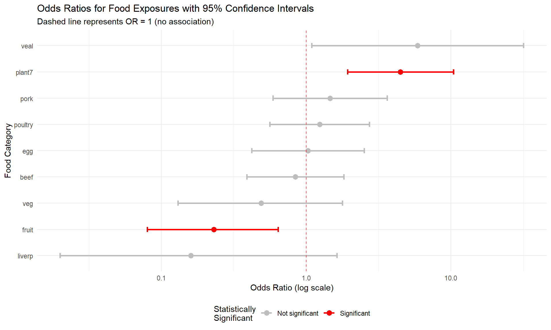 - Quantified food associations: Calculated odds ratios with confidence intervals for each food exposure