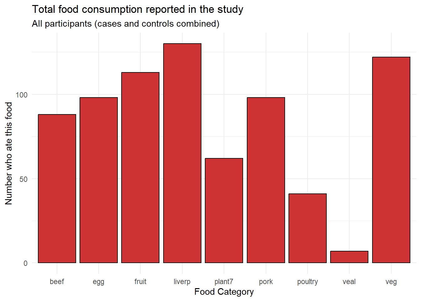 Additionally, we have 9 food exposure variables indicating whether each person consumed specific foods: beef, pork, veal, poultry, liverp (liver pâté), veg (vegetables), fruit, egg, plant7.