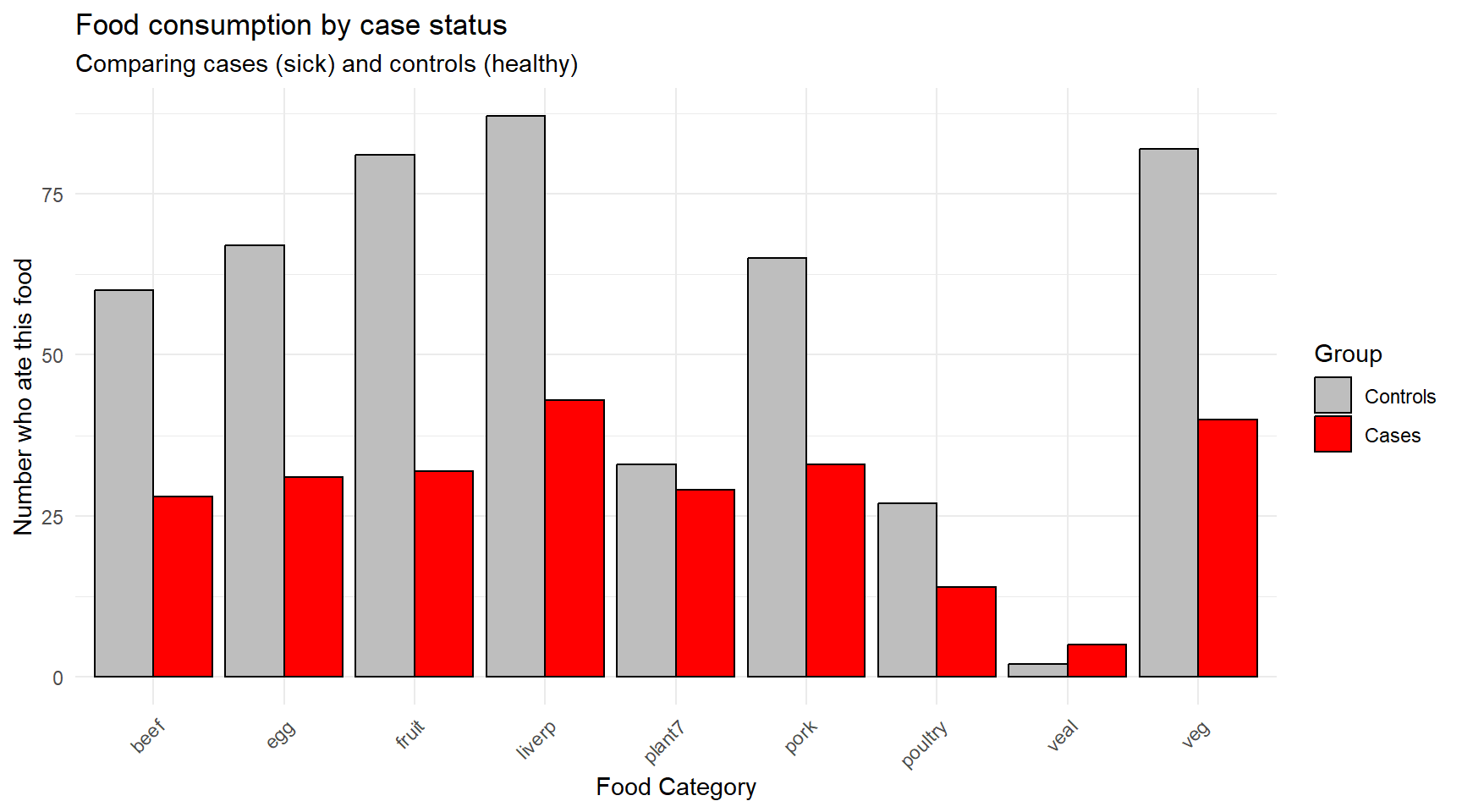 However, the key question in outbreak investigation is not just which foods were commonly eaten, but which foods show a difference between cases (sick people) and controls (healthy people). Let’s create a comparison visualization.